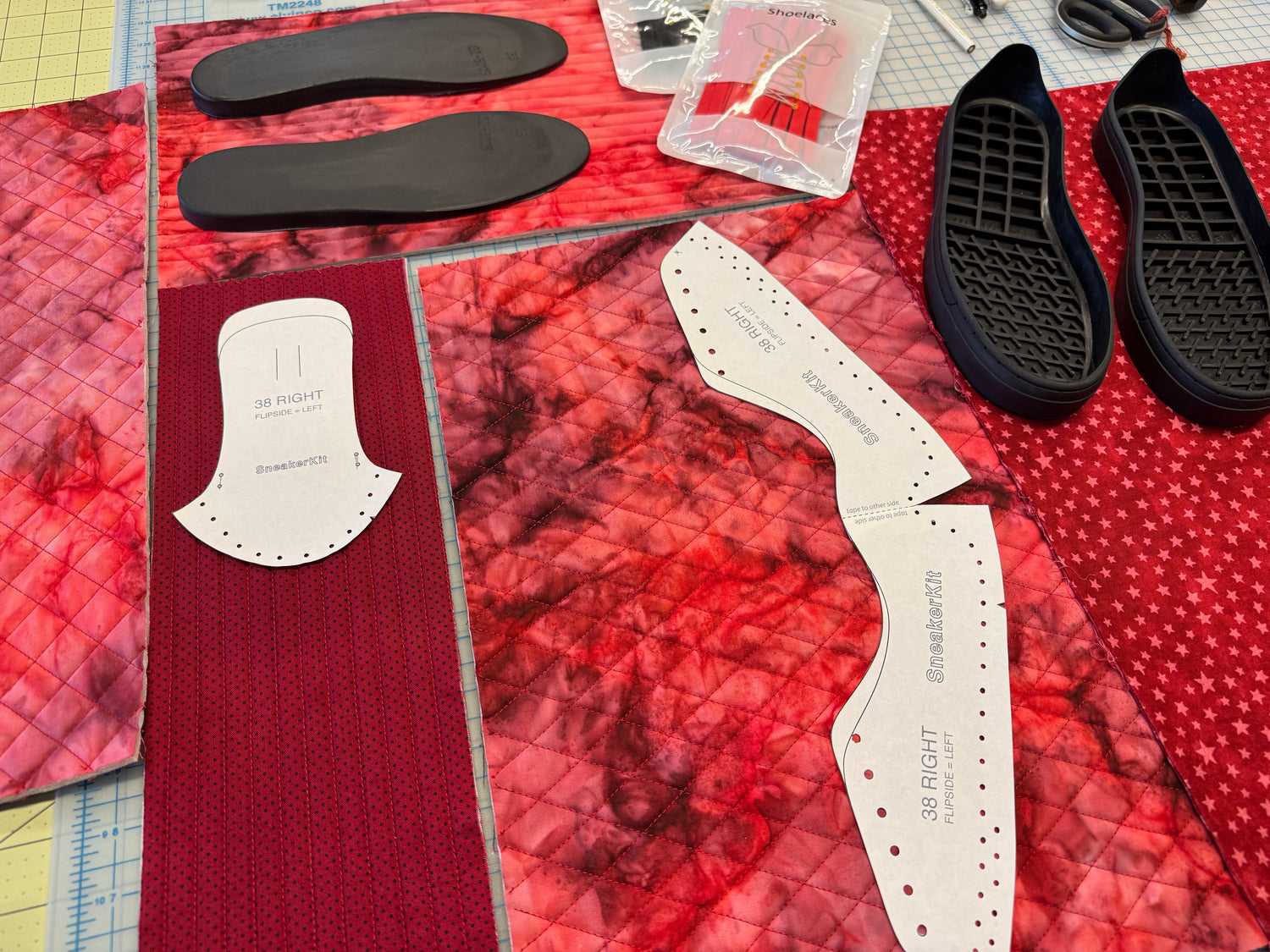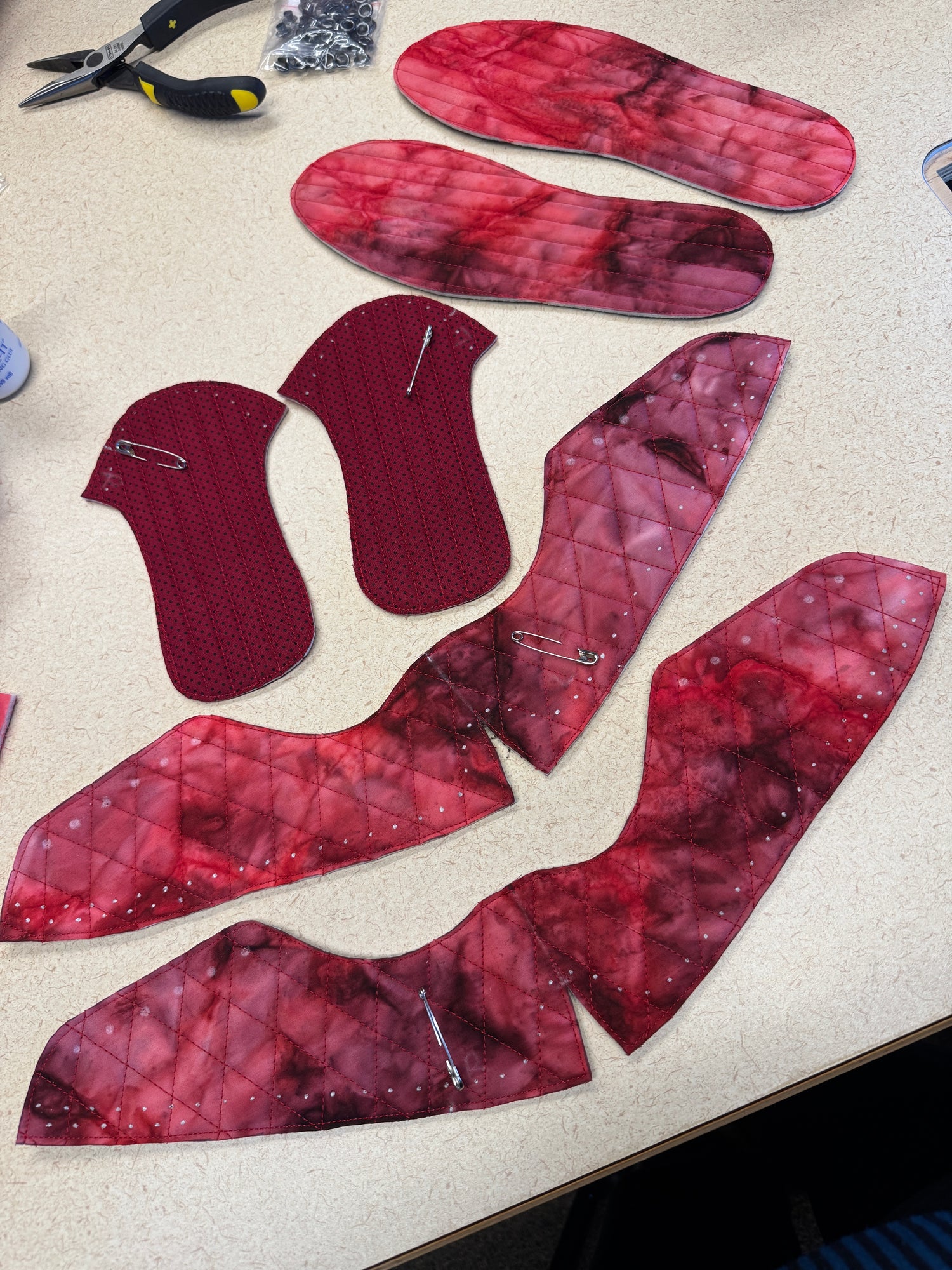 Exterior- Cotton quilting weight fabric from my stash. Sole kit from workshop.